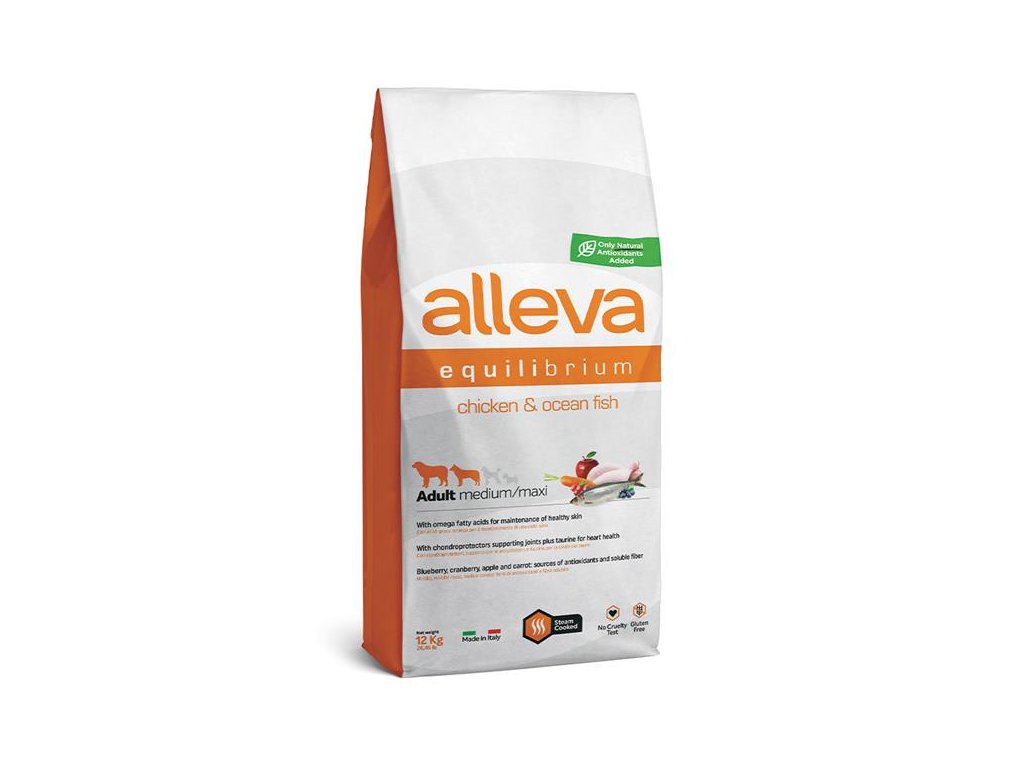 ALLEVA EQUILIBRIUM Dog Dry Adult Chicken & Ocean Fish 12 kgKompletní krmivo Equilibrium Chicken & Ocean Fish pro dospělé psy středních a velkých plemen. Kuřecí je zdrojem vysoce stravitelných bílkovin a bohaté na vitamíny skupiny B. Mořské ryby (sleď) jsou obzvláště bohaté na omega-3 mastné kyseliny, které prospívají zdraví kůže a srsti a mají také protizánětlivé vlastnosti. Receptura je bezlepková a obohacená sušeným ovocem a zeleninou. Obsahuje přírodní antioxidanty a rozpustnou vlákninu. Vyrobeno ze surovin pocházejících převážně z Itálie, Francie a severní Evropy.