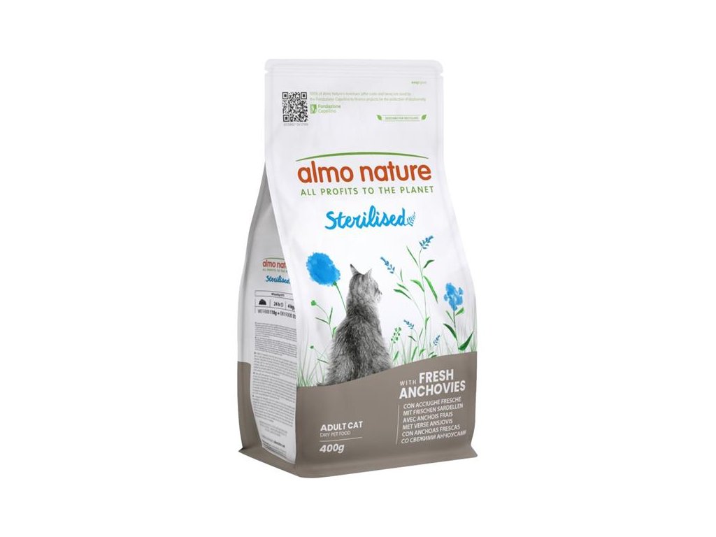 Almo Nature cat Sterilised ančovičky 400gAlmo Nature Sterilised je kompletní krmivo určené pro kastrované a méně aktivní dospělé kočky. Nízký obsah tuku a hořčíku spolu s dostatečným množstvím vlákniny činí z této receptury vhodnou volbu pro sterilizované kočky a kočky se sklonem k nadváze. Ideální je v kombinaci s kapsičkami Sterilised. Jako hlavní složku obsahuje 26 % čerstvých ryb (ančoviček), které zajišťují vysokou chutnost krmiva. Dále je krmivo obohaceno o omega-3 a omega-6 mastné kyseliny, minerály, vitamíny, taurin, L-karnitin a prebiotika pro podporu střevní mikroflóry. Granule jsou konzervovány přírodně, neobsahují GMO, dochucovadla, barviva ani soli.