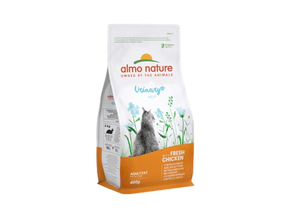 Almo Nature cat Urinary Help kuře 400gAlmo Nature Urinary Help je kompletní krmivo určené pro dospělé kočky trpící na struvitové močové kameny. DL-methionin snižuje pH moči a vytváří tak nepříznivé prostředí pro tvorbu struvitových krystalů. Nízký obsah hořčíku, vápníku a fosforu v kombinaci s glukosaminem pomáhá k udržení zdravého močového ústrojí. Jako hlavní složku krmivo obsahuje 26 % čerstvého kuřecího masa, které zajišťuje jeho vysokou chutnost. Dále je obohaceno o omega-3 a omega-6 mastné kyseliny, minerály, vitamíny, taurin a L-lysin pro podporu imunitního systému. Granule jsou konzervovány přírodně, neobsahují GMO, dochucovadla, barviva ani soli.
