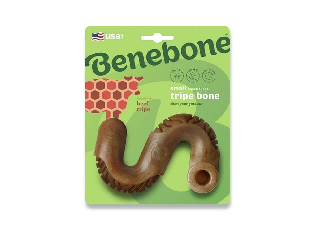 Benebone Bone dršťky SHračka s příchutí hovězích drštěk, která vydrží silné kousání a žvýkání. Díky zakroucenému tvaru se psům dobře uchopuje do zubů a mohou si ji snadno přidržet tlapkou. Hračka má v sobě prohlubně a drážky, do nichž lze vložit vlhké krmivo (paštiku, kapsičku či konzervu) nebo jiný vhodný pamlsek. Drážky navíc napomáhají přirozenému čištění zubů.