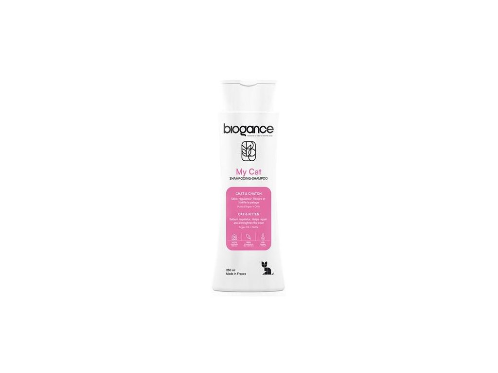 Regenerační šampon pro kočky Biogance My Cat obsahuje výtažky z břízy a arganový olej, ty mají vyživující, regenerační a preventivní vlastnosti.
