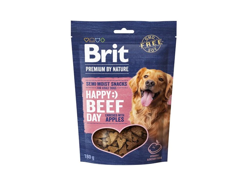 Brit Premium by Nature Dog Semi Snack Beef&Apple 180gPamlsky Happy Day hovězí s jablky mají poloměkkou strukturu, která je ideální pro psy všech plemen a velikostí. Jsou šetrné k zubům a chuťově bohaté. Jsou vyrobeny z hovězího proteinu, který je významným zdrojem esenciálních aminokyselin důležitých pro růst a regeneraci svalové hmoty. Dále obsahuje železo a vitamín B12, které podporují zdraví krve a nervového systému. Jablka jsou lahodným zdrojem vitamínu C a dietní vlákniny, která přispívá ke zdravému trávení.