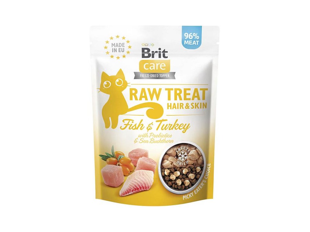 Brit RAW Treat Cat Hair&Skin, 40 gDoplňkové krmivo vhodné pro dospělé kočky žijící v bytě obsahuje 96 % čerstvého masa, které je zdrojem vysoce kvalitních bílkovin nezbytných pro kočičí zdraví. Mrazem sušené (lyofilizované) pamlsky lze použít i jako lahodný doplněk granulí, který promění běžné krmení v neodolatelný zážitek.