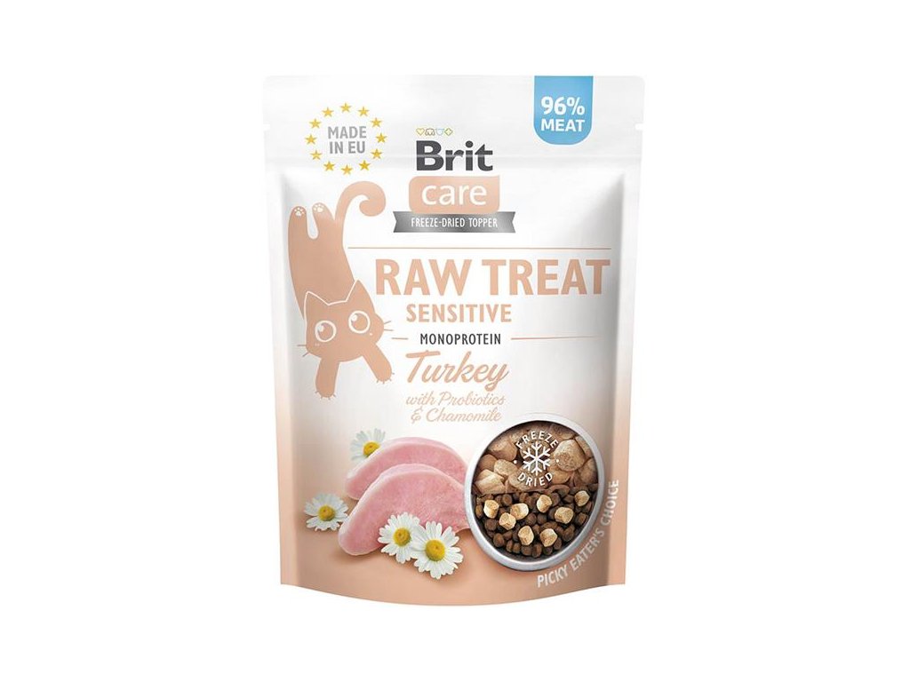 Brit RAW Treat Cat Sensitive, 40 gDoplňkové krmivo vhodné pro kočky žijící v bytě obsahuje 96 % čerstvého masa, které je zdrojem vysoce kvalitních bílkovin nezbytných pro kočičí zdraví. Mrazem sušené (lyofilizované) monoproteinové pamlsky lze použít i jako lahodný doplněk granulí, který promění běžné krmení v neodolatelný zážitek.