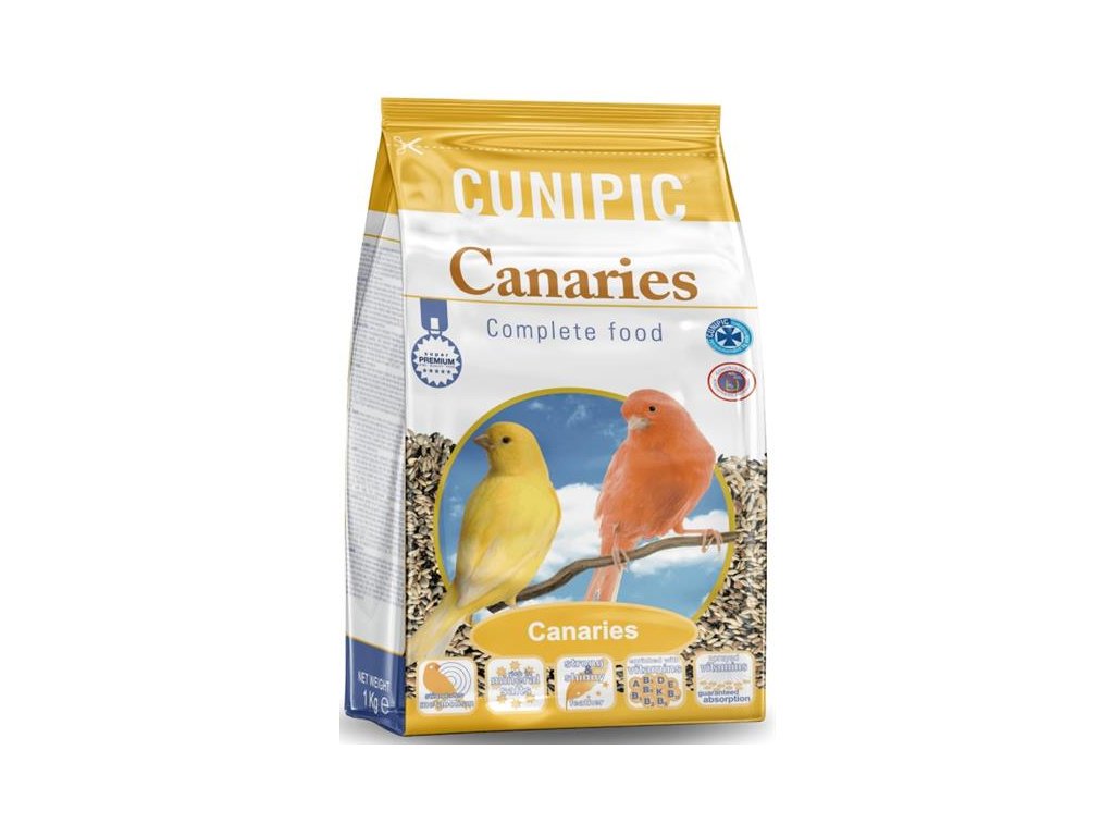 Cunipic Canaries - Kanár 1 kgCunipic® Canaries - kompletní krmivo bohaté na uhlohydráty a bílkoviny, speciálně vyvinuté pro kanárky. Obsahuje 6 druhů semínek. Krmivo je bohaté na vitaminy A, B1, B2, B6, B12, C, D, E, H, K, na uhlohydráty a minerální soli; povzbuzuje metabolismus a podporuje zdravé a lesklé peří. Vitaminy jsou do krmiva přidávány formou nástřiku na jednotlivých zrníčkách, čímž máte jistotu, že pták vitaminy přijme.