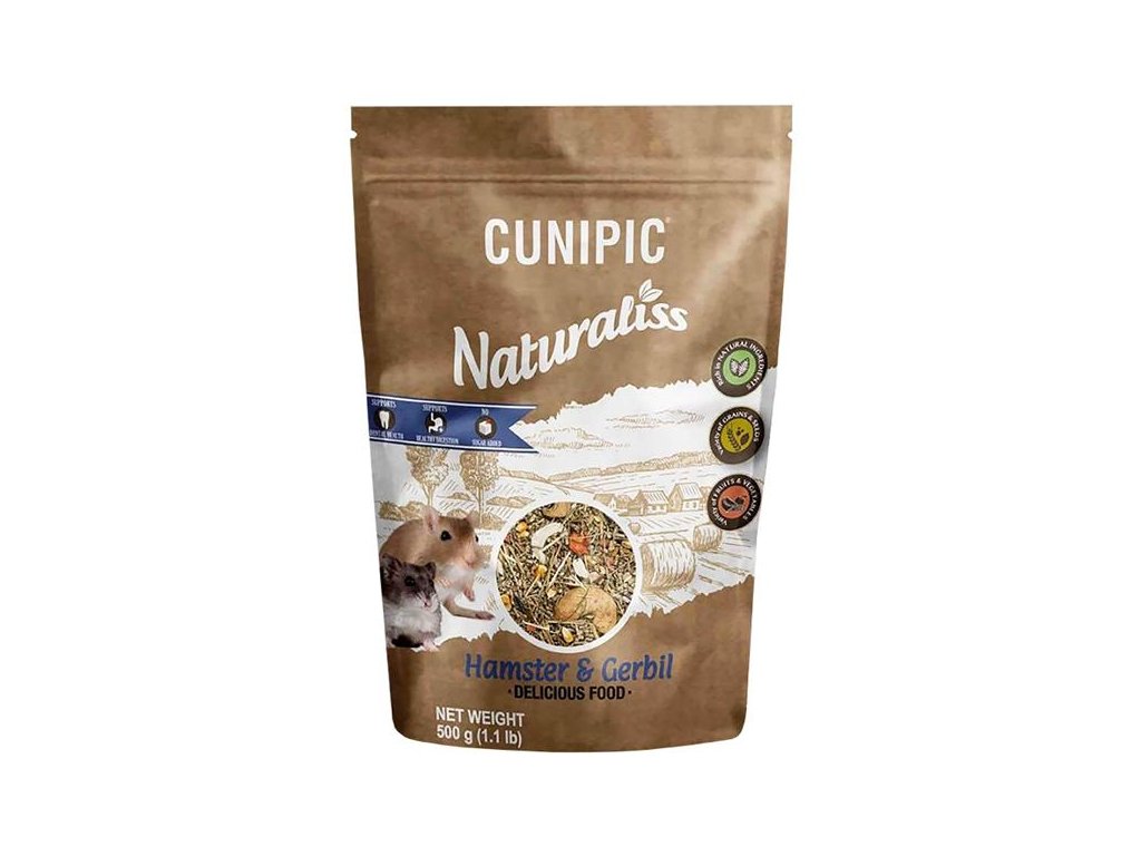 Cunipic Naturaliss Hamster & Gerbil - křeček a pískomil 500 gPřírodní směs obsahující různé druhy obilovin a semen, ovoce a zeleninu.