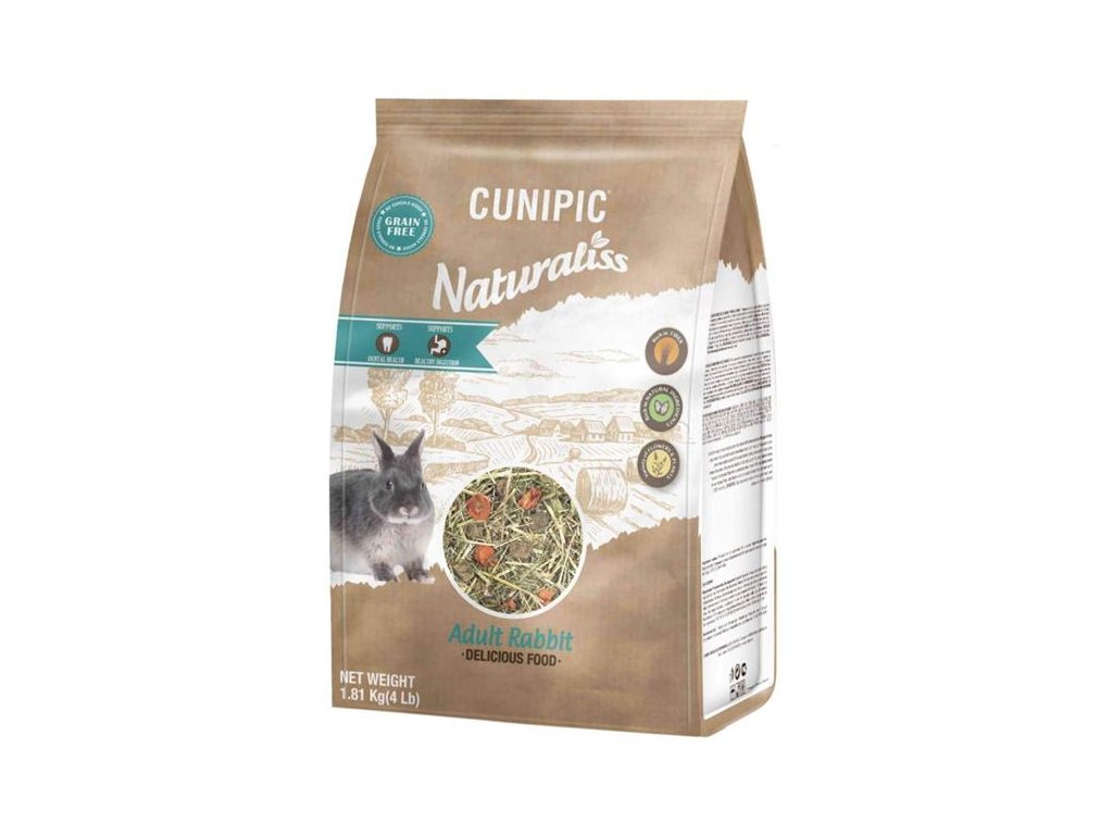 Cunipic Naturaliss Rabbit Adult - dospělý králík 1,81 kgPřírodní směs bez obilovin (grain free) s vysokým podílem vlákniny, obsahující seno s více než 40 druhy rostlin, za studena lisované pelety, byliny a plané rostliny.