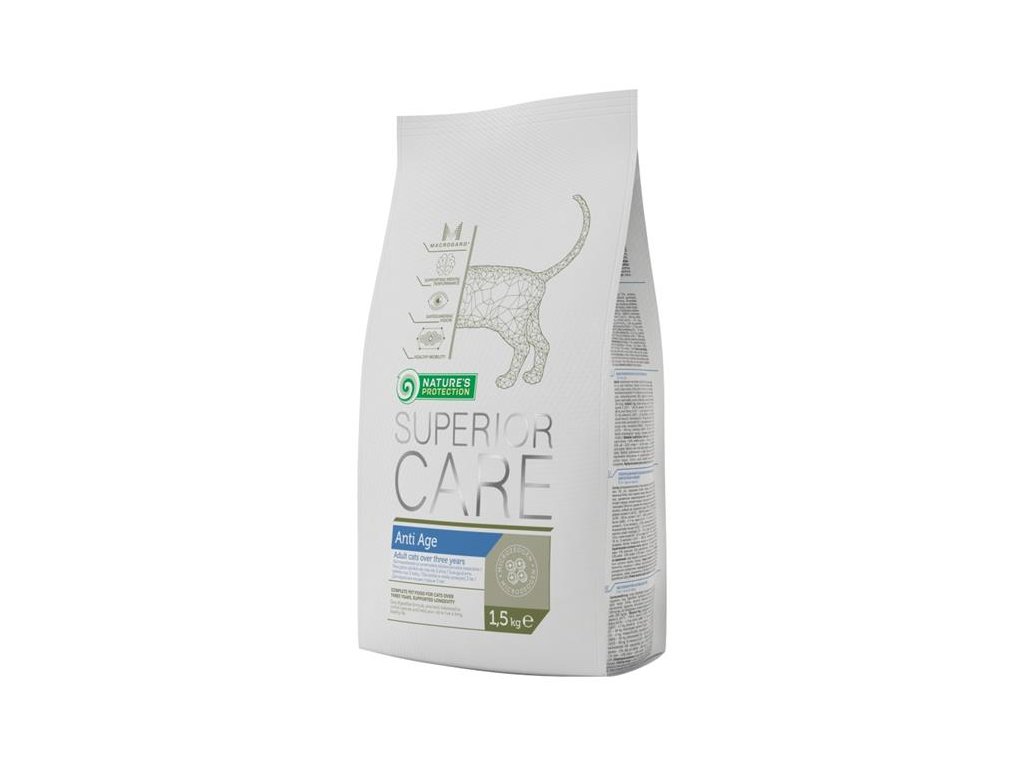 Nature''s Protection Cat Dry Superior Anti Age 1,5 kgNature‘s Protection Superior Care Anti Age – speciální krmivo určené kočkám všech plemen nad 3 roky věku. Toto krmivo je navrženo tak, aby splňovalo všechny požadavky na jejich výživu, podpořilo správné dospívání a zabránilo předčasným známkám stárnutí.