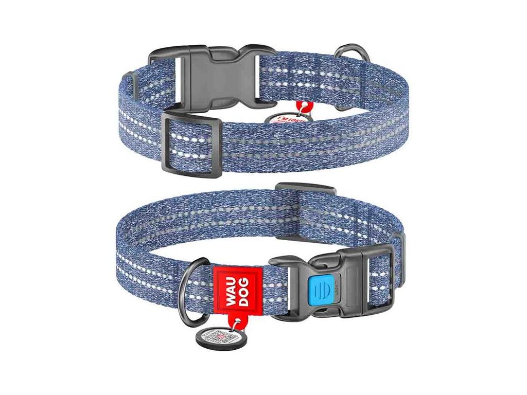 Obojek bavlna 25mmx37-58cm WAUDOG tm.modrýObojek WAUDOG Re-cotton kombinuje klasický styl a kvalitní provedení s využitím nových technologií. V zájmu udržitelnosti je vyroben z recyklovaných surovin. Pásek je z recyklované bavlny, pevného, ale lehkého, prodyšného a na dotek velmi příjemného materiálu s hypoalergenním složením. Obojek se snadno udržuje – lze jej prát – a po namočení velmi rychle schne. Pro větší bezpečnost má reflexní prošití a Smart ID známku s unikátním QR kódem.