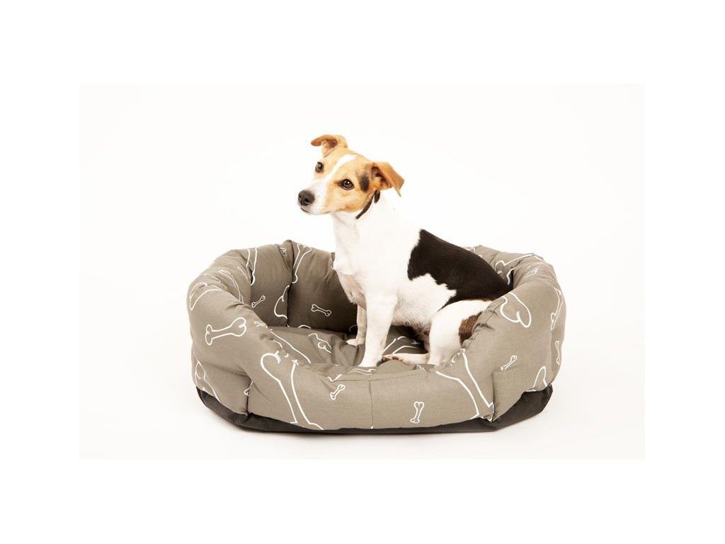 Pelech 8-hranný bavlněný Kost šedo/bílýPohodlný, kvalitní pelech vyrobený z bavlněné látky potištěné kostmi a kostičkami, vyplněný dutým vláknem. Pelíšek je v několika bodech prošitý, aby nedošlo k nerovnoměrnému rozmístění výplně. Polštářek je vyjímatelný. Boky pelíšku jsou kvůli dobré opoře bohatě vyplněny. Pelech se lehce udržuje.