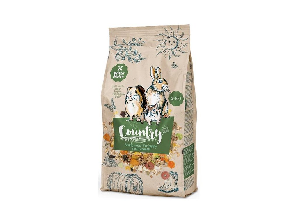 Witte Molen Country Snack Muesli - pamlsková směs dr.savec 800 gSpolečnost Witte Molen vyrábí krmiva již od roku 1740 a tato pamlsková směs – WitteMolen Country Snack pro králíky a hlodavce – představuje v jejich portfoliu návrat ke klasickým krmivům. Jde o kvalitní, vyvážené doplňkové krmivo se sušenou mrkví, bylinkami a ořechy. Kombinace těch nejlepších přírodních surovin sestavená na základě odborných znalostí o potřebách králíků a hlodavců zaručí vaši mazlíkům kvalitní stravu, na kterou se vy i oni můžete spolehnout.